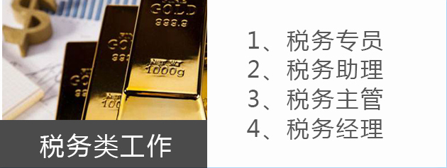 稅務類工(gōng)作1、稅務專員 2、稅務助理(lǐ) 3、稅務主管 4、稅務經理(lǐ)